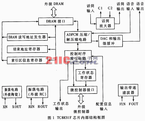 | 摘要:提出了一种对基于TC8831F系列芯片的数字语音复读机进行改进的方案。该方案能够以很低的软硬件代价,将复读机的语音记录时间延长到原来的4倍,或者在不缩短语音记录时间的情况下大大降低复读机的制造成本,非常值得在使用此系列芯片的语音产品中推广应用。     关键词:专用语音芯片 语音复读机 DRAM 存储器容量扩展 TC8831F系列芯片是东芝公司生产的一款低成本高性能的数字语音录放专用集成电路。TC8831F芯片是一块数模混合的大规模集成电路,其结构框图如图1所示。内部集成了构成典型数字语音录放系统所需要的大部分功能电路,包括两级可选用的总增益达46dB的话筒信号放大器,A/D、D/A、ADPCM压缩及解压缩电路(支持的比特率为32/22/16/11kbps可选)?熏输出语音带通滤波器、外接DRAM接口电路?熏MCU控制单元接口电路。使用该芯片,只需外接DRAM、MCU和输出端的音频功放电路等少量电路就可实现一个典型的录放音系统。该芯片具有功能齐全、应用电路结构简单、操作控制方便、功耗低以及使用廉价的DRAM作为语音存储介质等优点,因此成本低廉,被广泛应用于对成本非常敏感的一些海量生产的民用产品中,如语音复读机、电话答录机、留言系统等。