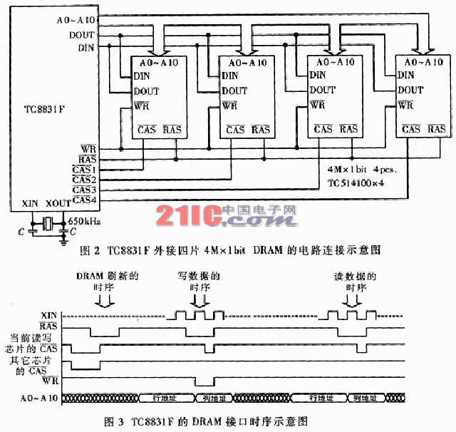 1 硬件修改工作 TC8831F外接4片4M×1bit DRAM时的电路连接如图2所示。4M×1bit DRAM的地址总线有22位,分为高位地址即行地址(Row address)和低位地址即列地址(Column address),两者通过分时复用,共用11根引脚A0~A10,每片DRAM的寻址范围为000000H~3FFFFFH,各片DRAM通过不同的CAS信号线来区别(见图3)。在TC8831F内部,4片DRAM联合寻址,因此寻址范围是000000H~FFFFFFH。相邻存储器芯片之间,系统自动切换,无需用户干预。针对不同的系统读写速度要求,DRAM有多种不同的读写模式和存储单元的数据刷新方式。在本系统中,由于所需要的数据速率非常低,所以读写模式是最简单的普通读写模式,也就是读写每一位数据之前发送完整的地址信号,包括行地址和列地址,然后进行读写;而刷新模式采用cas-before-ras方式,并将刷新脉冲穿插到读写时序中间。图3示出了TC8831F的DRAM接口的刷新、写数据和读数据的控制线时序图(数据时序略)。