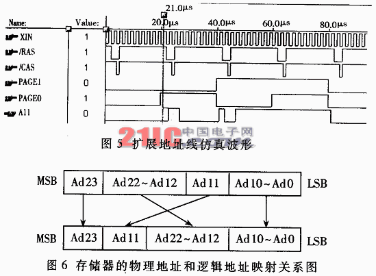 扩展地址线仿真波形如图5所示。XIN、/RAS、/CAS分别是该芯片的时钟源、DRAM行选通信号、DRAM列选通信号,PAGE0、PAGE1是由MCU输出的页面选择信号。在“PAGE1、PAGE0”分别为“00”、“01”、“10”、“11”时,A11引脚的控制信号在/RAS、/CAS的下降沿到来之前有效地建立了复用的地址信号00、01、10、11,这个信号就是访问不同的空间所需要的地址信号。扩展之后,访问DRAM的逻辑地址到DRAM的实际的物理地址的映射关系如图6所示,上面的是逻辑地址,下面的是物理地址。映射之后,DRAM的A0~A10引脚对应着存储单元的逻辑空间低22位地址。因此在引脚A11的信号确定的情况下,就将由引脚A0~A10所能访问的每片DRAM上的各个分散的物理存储空间映射成连续的逻辑空间,每片DRAM对应的这个连续的逻辑空间大小就是4M×1bit,相当于扩展前的一片DRAM,4片16M×1bit DRAM对应的4片逻辑连续空间的总和与使用四片4M×1bit DRAM时提供的空间将是完全一样的。改变A11的控制信号,也就是通过MCU改变PAGE0、PAGE1,将获得4块不同的存储空间,从而完成最终的存储空间的扩展。